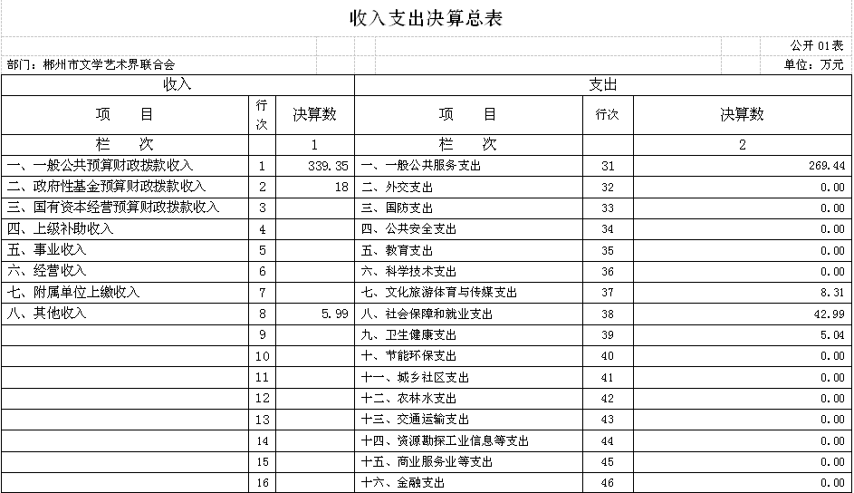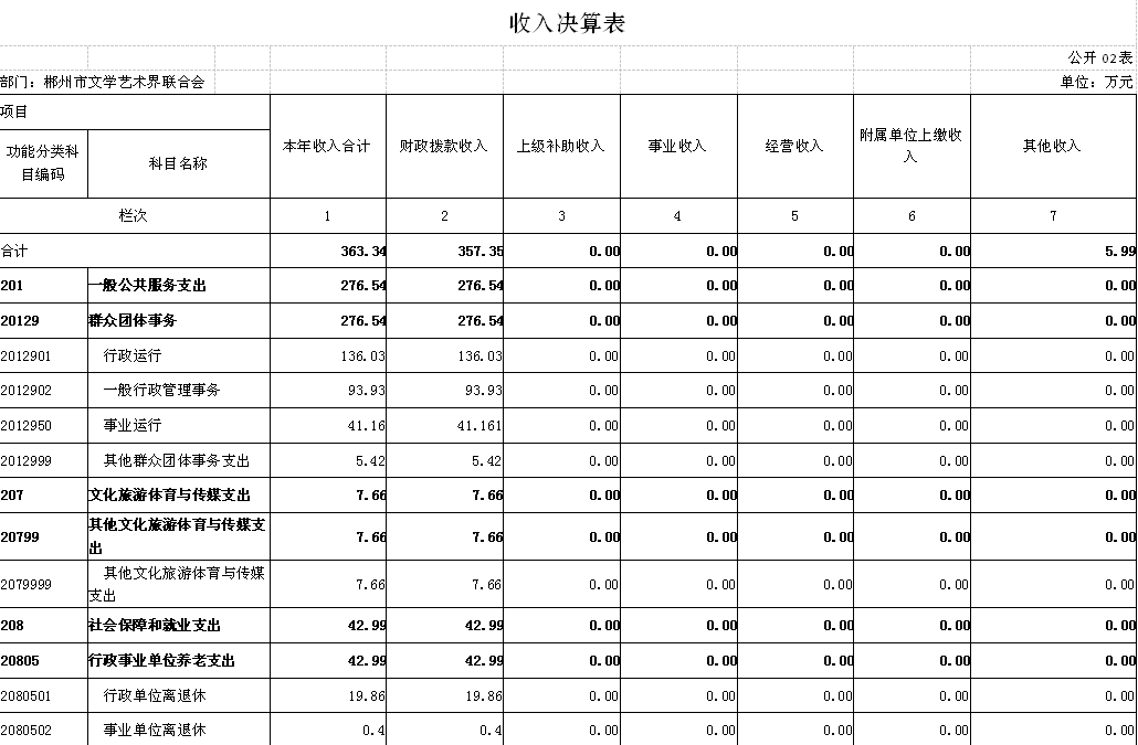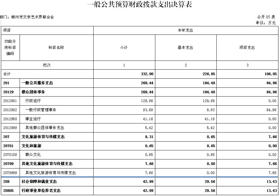 业务工作经费103.38万元,其中财政拨款103万元,主要用于出版出版《郴州文艺》6期,出版《郴州文艺作品年选》文学卷、艺术卷,举办送文化下乡4次,并开展了书法、美术、摄影展览、义写春联等惠民活动。