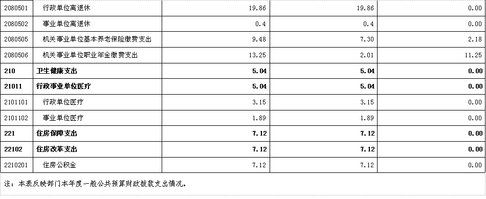 2020年度财政拨款支出332.90万元,主要用于以下方面:一般公共服务(类)支出269.44万元,占80.94%;文化旅游体育与传媒(类)支出8.31万元,占2.5%;;社会保障和就业(类)支出42.99万元,占12.91%;卫生健康(类)支出5.04万元,占1.51%;住房保障(类)支出7.12万元,占2.14%。