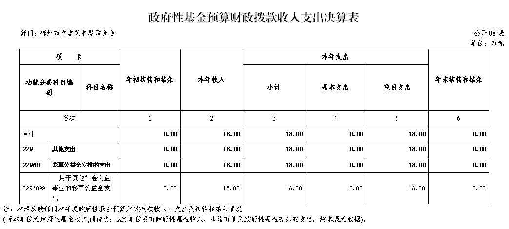 2020年度政府性基金预算财政拨款收入18万元;年初结转和结余0万元;支出18万元,其中基本支出0万元,项目支出18万元;年末结转和结余0万元。