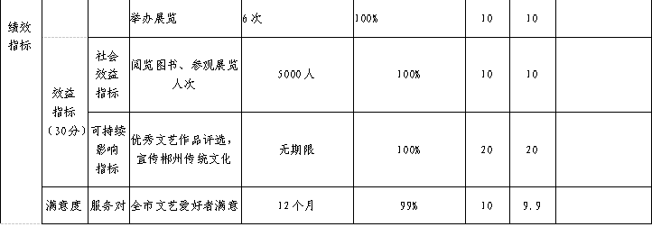 整体支出绩效目标:繁荣文艺创作,每年重点推广1-2项文艺作品的创作和传播。开展各类展览,讲座丰富郴州人民精神文化生活。为文艺工作者创作采风提供必要的工作条件和成果展示平台。