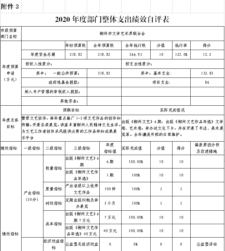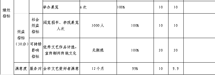 整体支出绩效目标:繁荣文艺创作,每年重点推广1-2项文艺作品的创作和传播。开展各类展览,讲座丰富郴州人民精神文化生活。为文艺工作者创作采风提供必要的工作条件和成果展示平台。