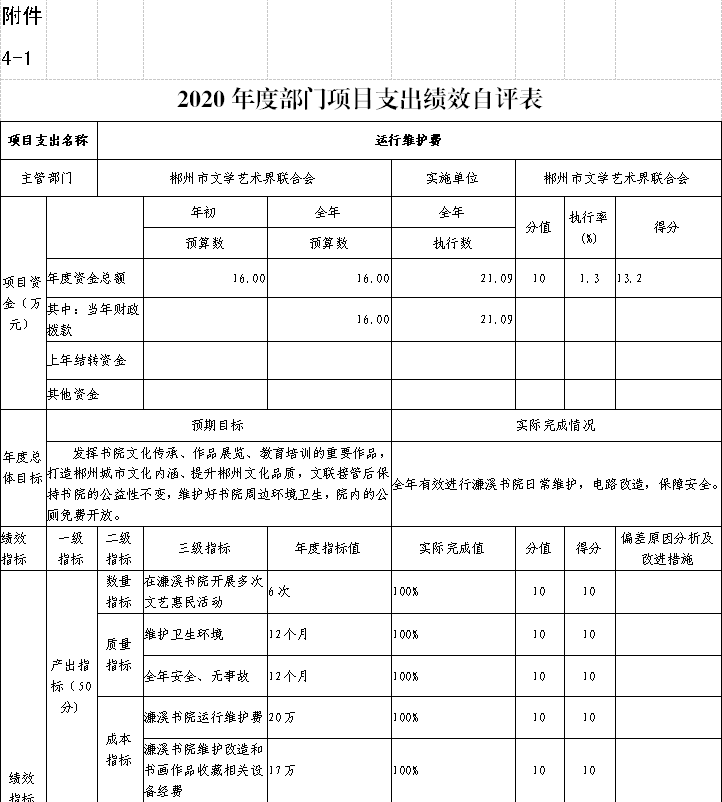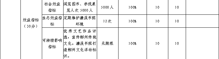 濂溪书院运行维护费绩效目标:发挥书院文化传承、作品展览、教育培训的重要作品,打造郴州城市文化内涵、提升郴州文化品质,文联接管后保持书院的公益性不变,维护好书院周边环境卫生,院内的公厕免费开放。