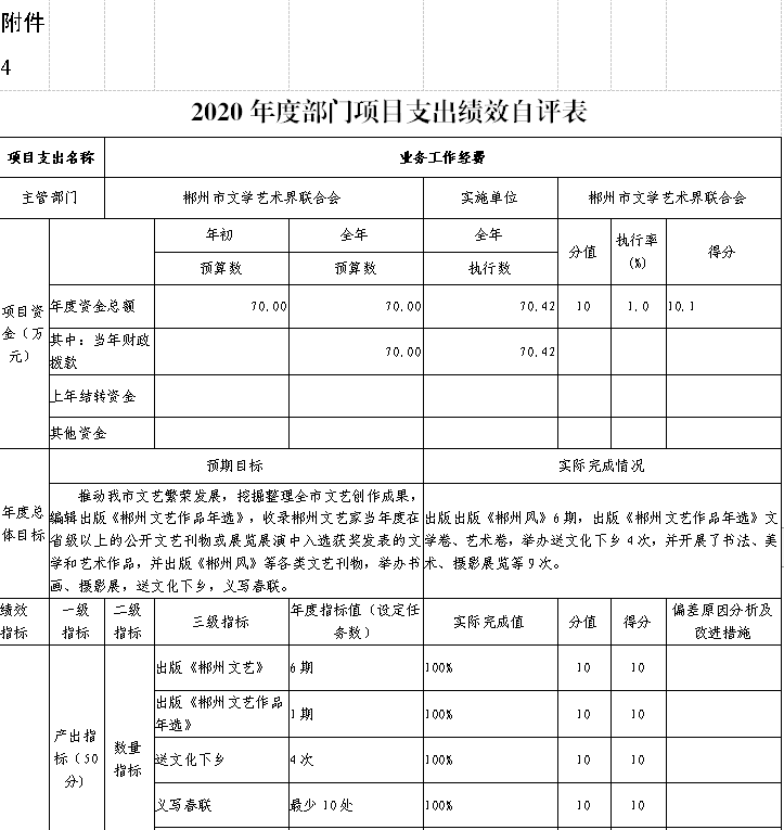 业务工作经费绩效目标: 推动我市文艺繁荣发展,挖掘整理全市文艺创作成果,编辑出版《郴州文艺作品年选》,收录郴州文艺家当年度在省级以上的公开文艺刊物或展览展演中入选获奖发表的文学和艺术作品。为推介郴州起到良好作用。并出版《郴州文艺》等各类文艺刊物,举办各类书画、摄影展,送文化下乡,义写春联,鼓励各类文艺爱好者产出文艺精品,宣传郴州。