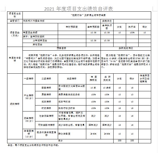 “扫黄打非”及新闻出版专项经费项目绩效自评综述:根据年初设定的绩效目标,项目绩效自评得分为100分。项目全年预算数为10.05万元,执行数为10.05万元,完成预算的100%。项目绩效目标完成情况:强力推进“扫黄打非”,责令整改文化经营企业10余家,收缴违法出版物2795(册)本,资兴市“6•06”侵犯著作权案被全国六部门挂牌督办,新增省级“扫黄打非”进基层示范点3个。发现的主要问题及原因:无。下一步改进措施:无。