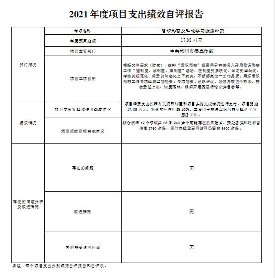 意识形态及理论学习服务经费项目绩效自评综述:根据年初设定的绩效目标,项目绩效自评得分为100分。项目全年预算数为17.08万元,执行数为17.08万元,完成预算的100%。项目绩效目标完成情况:综合梳理12个领域共63条240余个可能存在的风险点。查处各类违法有害信息2760余条,累计办理重要网站网民留言5400余条。发现的主要问题及原因:无。下一步改进措施:无。