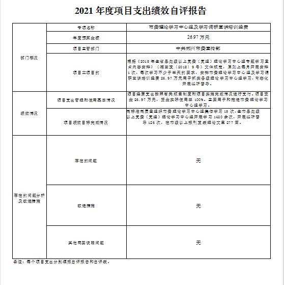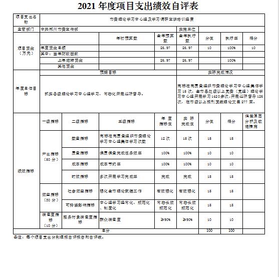 市委理论学习中心组及学习调研宣讲培训经费项目绩效自评综述:根据年初设定的绩效目标,项目绩效自评得分为100分。项目全年预算数为26.97万元,执行数为26.97万元,完成预算的100%。项目绩效目标完成情况:高标准高质量组织市委理论学习中心组集体学习15次,全市县处级以上党委(党组)理论学习中心组开展学习1420余次,开展巡听督导126次,在市级以上报刊发表理论文章277篇。发现的主要问题及原因:无。下一步改进措施:无。