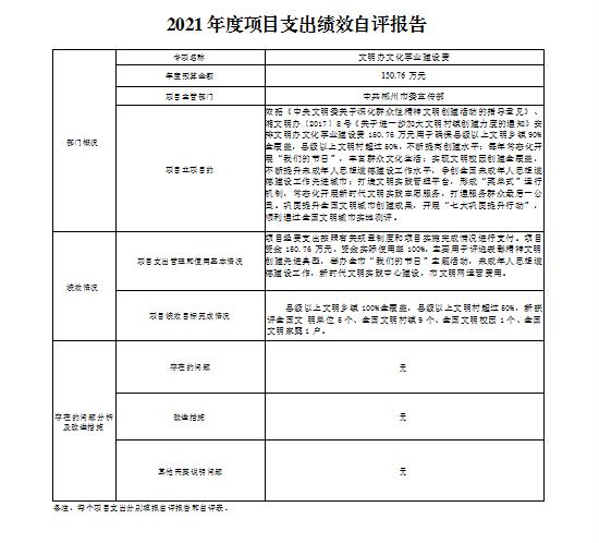 文明办文化事业建设费项目绩效自评综述:根据年初设定的绩效目标,项目绩效自评得分为100分。项目全年预算数为150.76万元,执行数为150.76万元,完成预算的100%。项目绩效目标完成情况:县级以上文明乡镇100%全覆盖,县级以上文明村超过50%,新获评全国文明单位5个、全国文明村镇9个、全国文明校园1个、全国文明家庭1户。1.抓实“五大创建”活动;2.深入推进“志愿之城”建设;3.推进公民思想道德建设工作; 4.推进未成年人思想道德建设。发现的主要问题及原因:无。下一步改进措施:无。