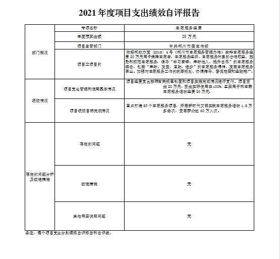 志愿服务经费项目绩效自评综述:根据年初设定的绩效目标,项目绩效自评得分为100分。项目全年预算数为20万元,执行数为20万元,完成预算的100%。项目绩效目标完成情况:重点打造53个志愿服务项目,开展新时代文明实践志愿服务活动1.8万多场次,受惠群众达60万人次。发现的主要问题及原因:无。下一步改进措施:无。