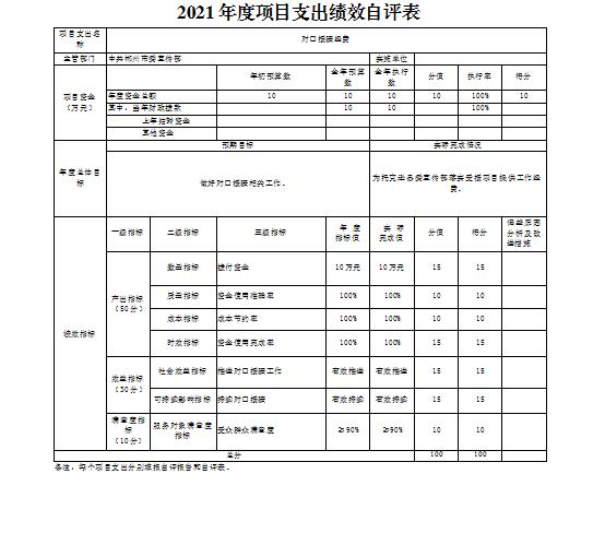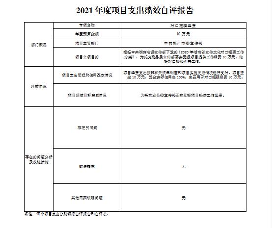 对口援疆经费项目绩效自评综述:根据年初设定的绩效目标,项目绩效自评得分为100分。项目全年预算数为10万元,执行数为10万元,完成预算的100%。项目绩效目标完成情况:为托克逊县委宣传部落实受援项目提供工作经费。发现的主要问题及原因:无。下一步改进措施:无。