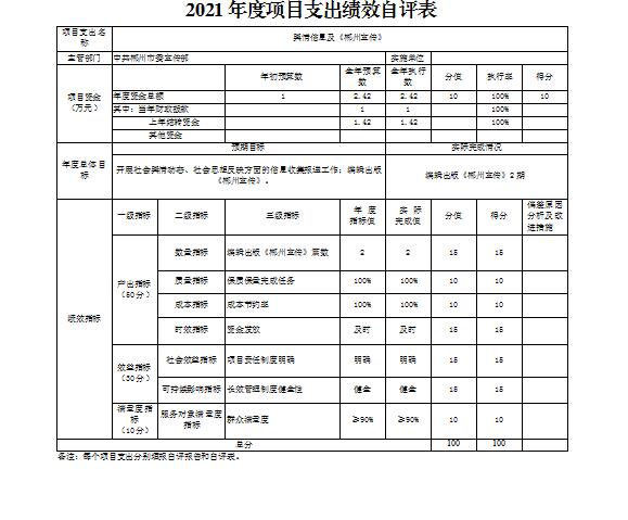 舆情信息及《郴州宣传》项目绩效自评综述:根据年初设定的绩效目标,项目绩效自评得分为100分。项目全年预算数为2.42万元,执行数为2.42万元,完成预算的100%。项目绩效目标完成情况:编辑出版《郴州宣传》2期。发现的主要问题及原因:无。下一步改进措施:无。