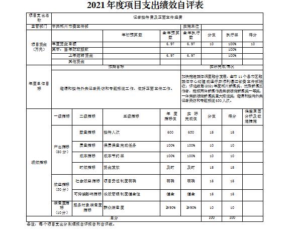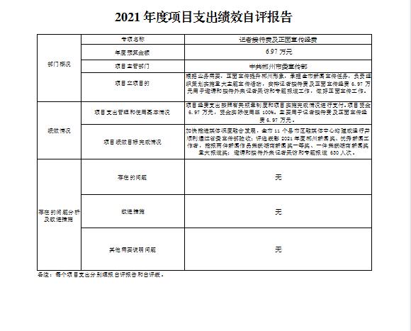 记者接待费及正面宣传经费项目绩效自评综述:根据年初设定的绩效目标,项目绩效自评得分为100分。项目全年预算数为6.97万元,执行数为6.97万元,完成预算的100%。项目绩效目标完成情况:加快推进媒体深度融合发展,全市11个县市区融媒体中心均建成运行并顺利通过省委宣传部验收;评选表彰2021年度郴州新闻奖、优秀新闻工作者,推报两件新闻作品荣获湖南新闻奖一等奖、一件荣获湖南新闻奖重大报道奖;邀请和接待外来记者采访和专题报道630人次。发现的主要问题及原因:无。下一步改进措施:无。