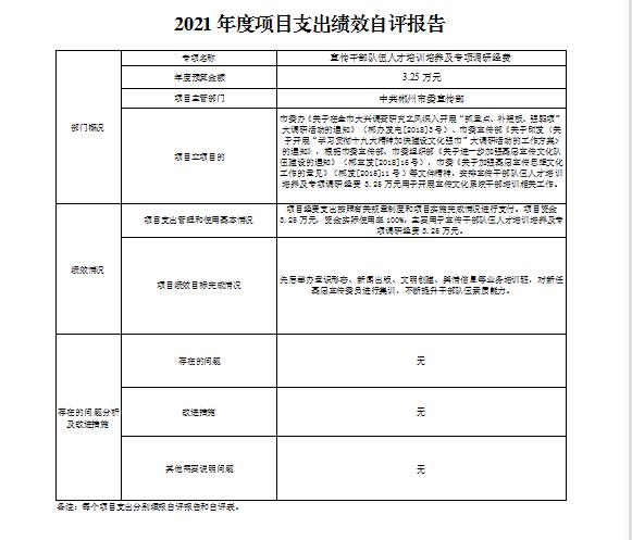 宣传干部队伍人才培训培养及专项调研经费项目绩效自评综述:根据年初设定的绩效目标,项目绩效自评得分为100分。项目全年预算数为3.25万元,执行数为3.25万元,完成预算的100%。项目绩效目标完成情况:先后举办意识形态、新闻出版、