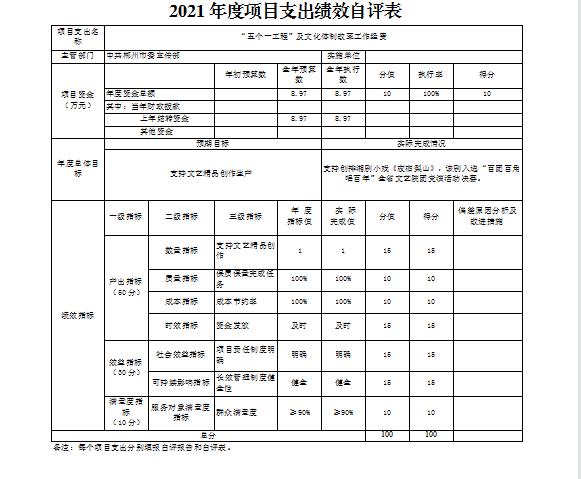 “五个一工程”及文化体制改革工作经费项目绩效自评综述:根据年初设定的绩效目标,项目绩效自评得分为100分。项目全年预算数为8.97万元,执行数为8.97万元,完成预算的100%。项目绩效目标完成情况:支持创排湘剧小戏《夜宿梨山》,该剧入选“百团百角唱百年”全省文艺院团竞演活动决赛。发现的主要问题及原因:无。下一步改进措施:无。