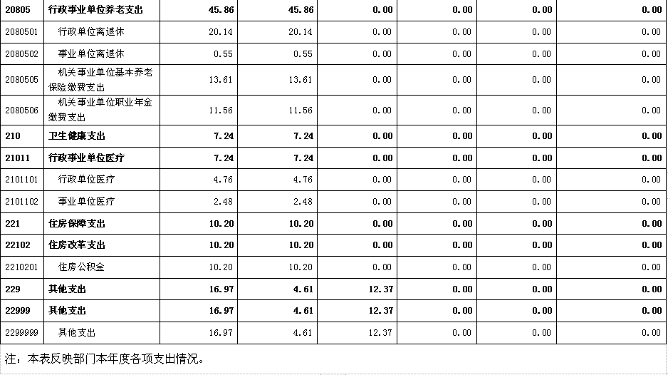 2021年度财政拨款基本支出281.82万元,其中:人员经费252.58万元,占基本支出的89.62%,主要包括基本工资、津贴补贴、奖金、伙食补助费、绩效工资、机关事业单位基本养老保险缴费、职业年金缴费、职工基本医疗保险缴费、其他社会保障缴费、住房公积金、医疗费、其他职工福利支出、对个人和家庭的补助;;公用经费29.24万元,占基本支出的10.38%,主要包括办公费、印刷费、邮电费、差旅费、维修(护)费、会议费、劳务费、工会经费、其他交通费、其他商品和服务支出。