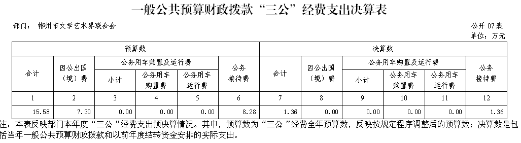 2、公务接待费支出决算为1.36万元,全年共接待来访团组15个、来宾162人次,主要是省文联、县市区文联来调研、汇报工作发生的接待支出。