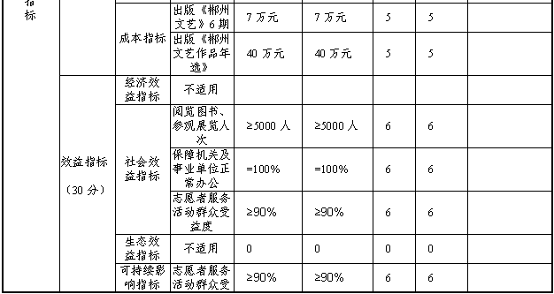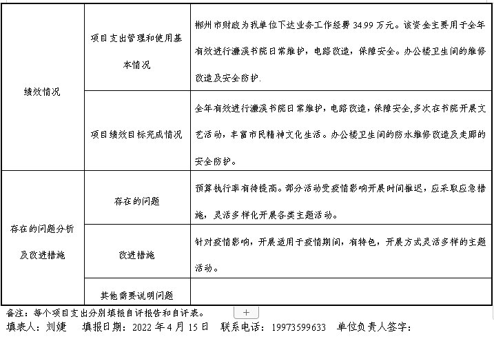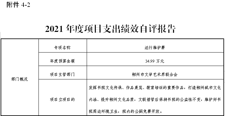 组织对“业务工作经费”“运行维护费”等2个项目开展了部门评价,涉及一般公共预算支出160.01万元,政府性基金预算支出0万元,国有资本经营预算支出0万元。从评价情况来看,我单位出版《郴州文艺》6期,出版《郴州文艺作品年选》文学卷、艺术卷,举办送文化下乡,并在开展了庆祝建党100周年系列书法、美术展览等。多样性的文艺活动,促使大量文艺创作者产出优秀作品,丰富了群众文化生活。全年有效进行濂溪书院日常维护,电路改造,保障安全,多次在书院开展文艺活动,丰富市民精神文化生活。办公楼卫生间的防水维修改造及走廊的安全防护。
