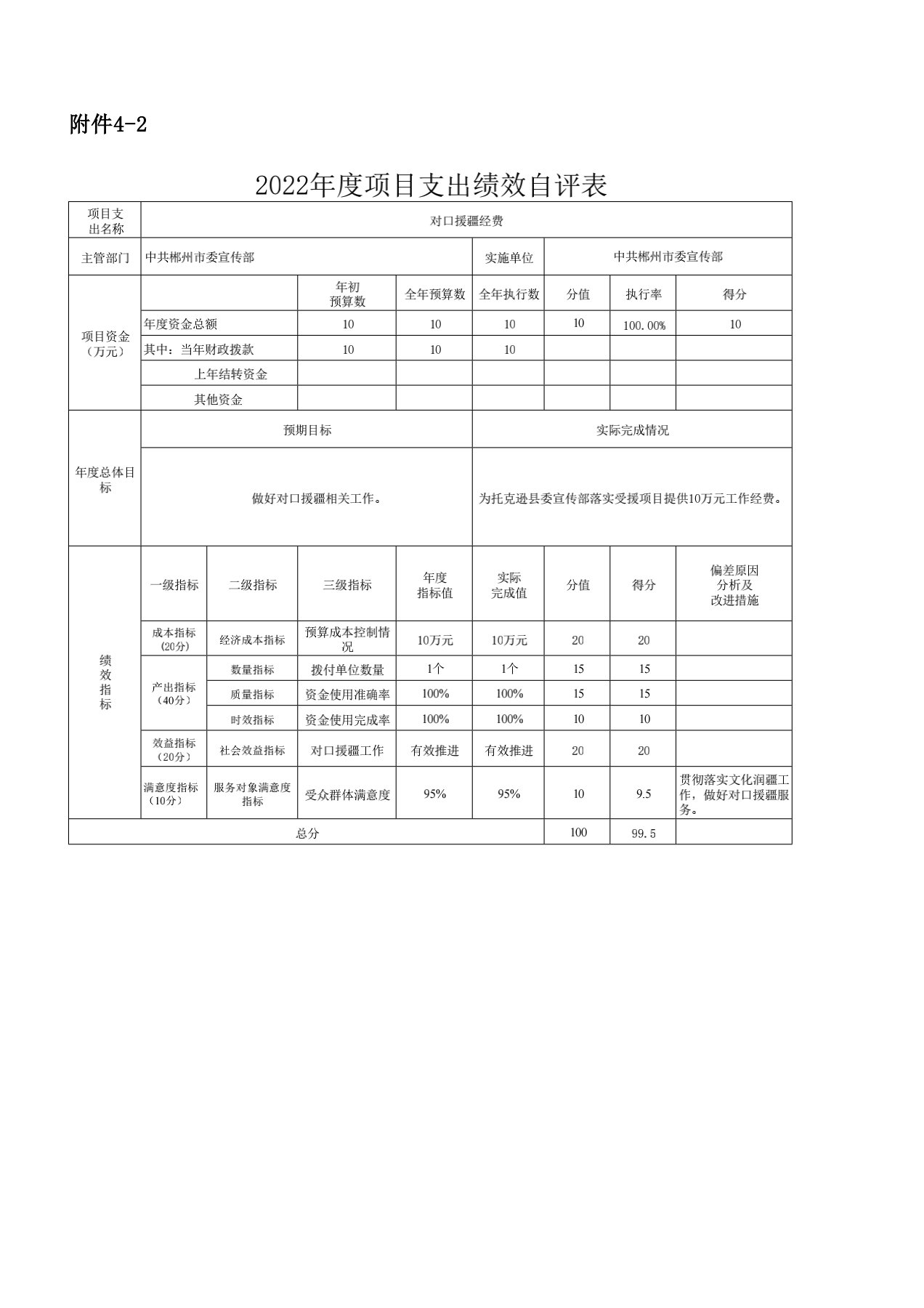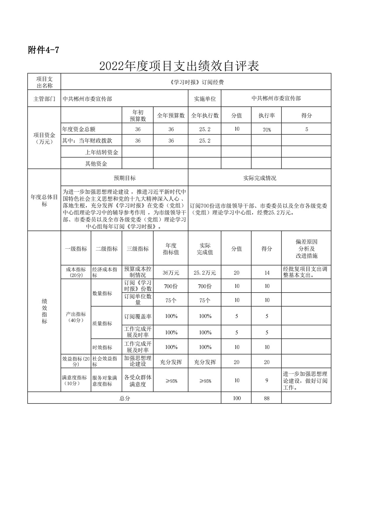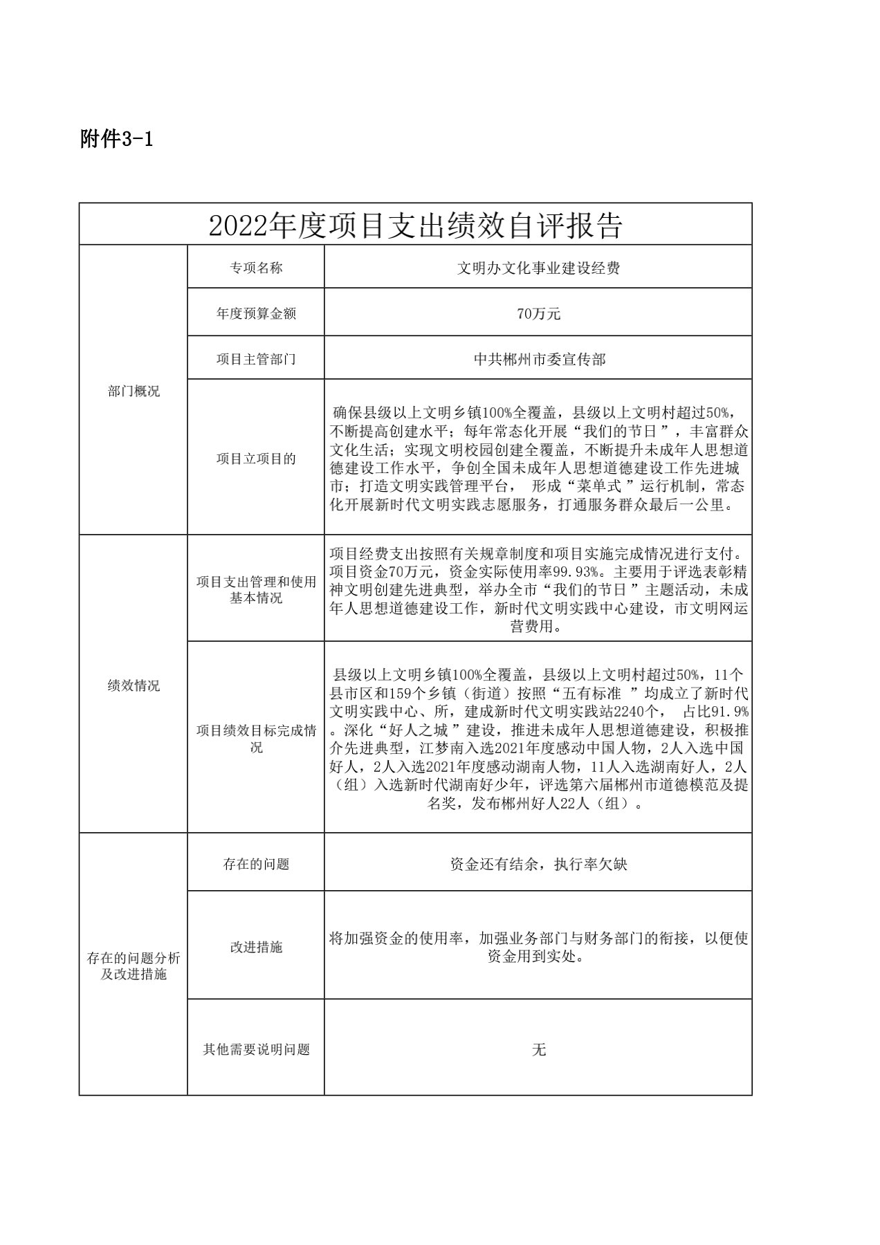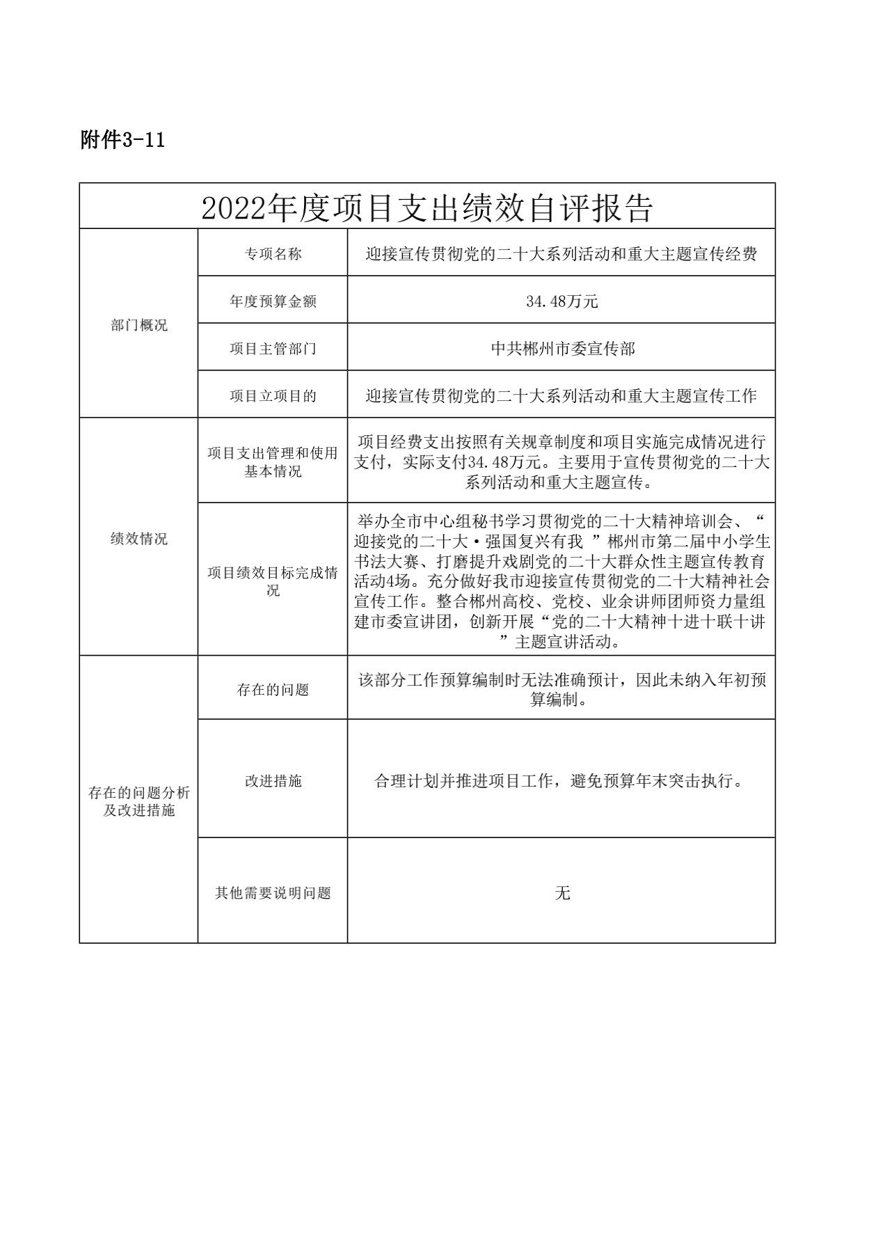 年度绩效目标完成情况:持续推进理论武装,抓好党的十九届六中全会、二十大精神的学习宣传贯彻工作。坚守意识形态底线,着力防范化解意识形态领域重大风险。大力推进新闻宣传和对外宣传,弘扬主旋律,讲好郴州故事,传播郴州声音。全面推进新时代文明实践中心建设,深化“好人之城”“志愿之城”“文明之城”“诚信之城”建设。加强干部培养使用,一批优秀系统干部得到提拔晋升。加强干部培训,积极选派系统干部参加省市举办的全省宣传部长培训班、十九届六中全会等专题网络培训班、市委党校中青年干部主体班等,不断增强干部队伍“四力”。推动文化事业产业加快发展、形成特色品牌。加强干部队伍培训培养,努力打造一支政治过硬、本领高强、求实创新、能打胜仗的宣传铁军。