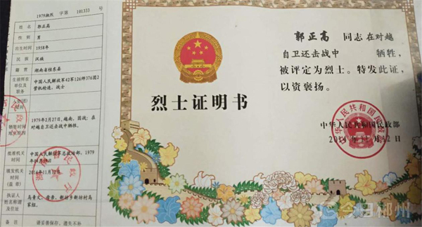 在桂东,志愿者走访了烈士家属乌冬青。乌冬青今年已有90岁,一生生养了4个儿子1个女儿,老伴25年前去世。三儿子郭正高曾在42军126师376团2营机枪连服役,1979年2月27日牺牲于对越自卫还击战。乌冬青说,接到儿子牺牲的消息已是1980年春忙时节,“当时哭晕在田里,我现在连他葬在哪也不知道,听说是在越南”。