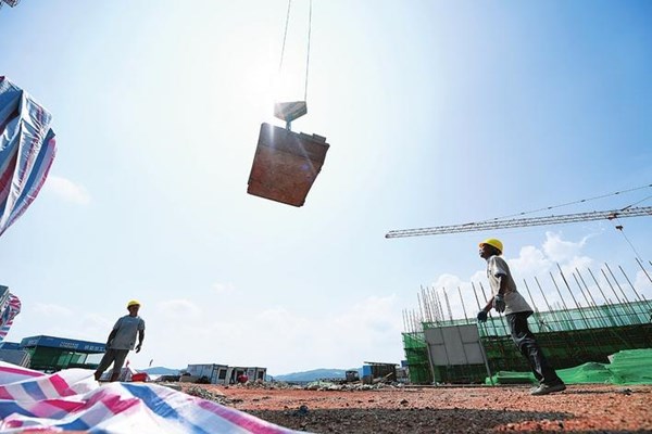 高温酷暑下,两名工人正在吊装施工材料。(来源:郴州日报 李科 摄)