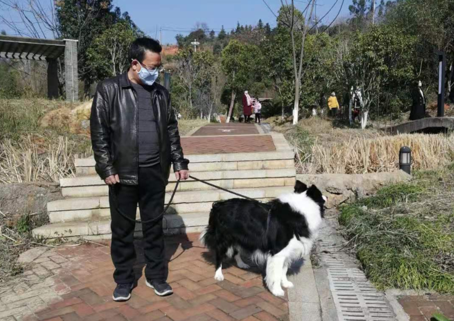 张跃华在公园牵绳遛狗。(图片来源:文明郴州)