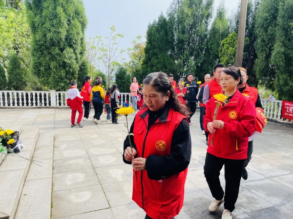 在苏仙区许家洞镇金银寨,郴州市志愿服务联合会组织全市各专业志愿服务组织的志愿者,手捧黄菊肃穆鞠躬,为功勋711铀矿中牺牲的460名英烈扫墓。