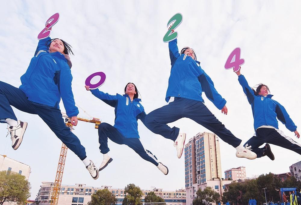 2023年12月31日,郴州市嘉禾县第五中学,学生手持“2024”字样创意留影,喜迎新年。(黄春涛 李宇欣 摄)