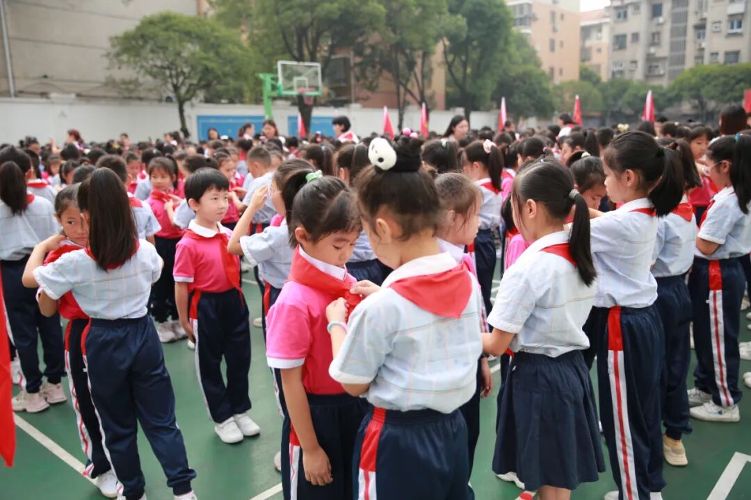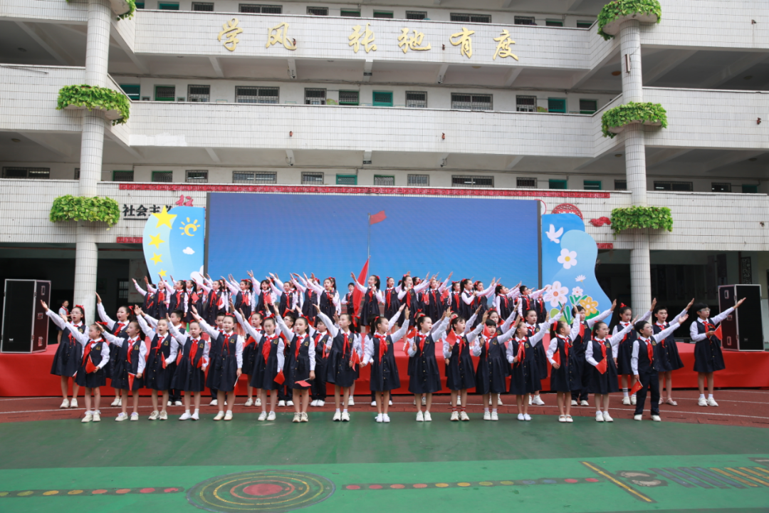 活动在舞蹈《飘扬的红领巾》中拉开帷幕。伴随着激昂的出旗曲,旗手护送鲜艳的队旗庄严入场,入队仪式正式启动。全体队员齐唱《中国少年先锋队队歌》,嘹亮的歌声传递出对少先队组织的热爱与忠诚。通过大队长宣布入队名单、老队员代表为新队员授红领巾、大队辅导员带领全体新队员宣誓等环节,200名新队员光荣加入中国少年先锋队,共计1700余名学生参加本次活动。