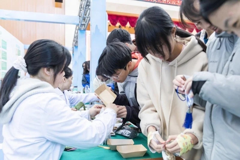中医文创香囊制作DIY 区域人气真旺!学子们围在一起,亲手调配中药材、穿针引线,制作专属香囊,传统草药知识与创意手工完美融合,激发了大家对中医药的浓厚兴趣。