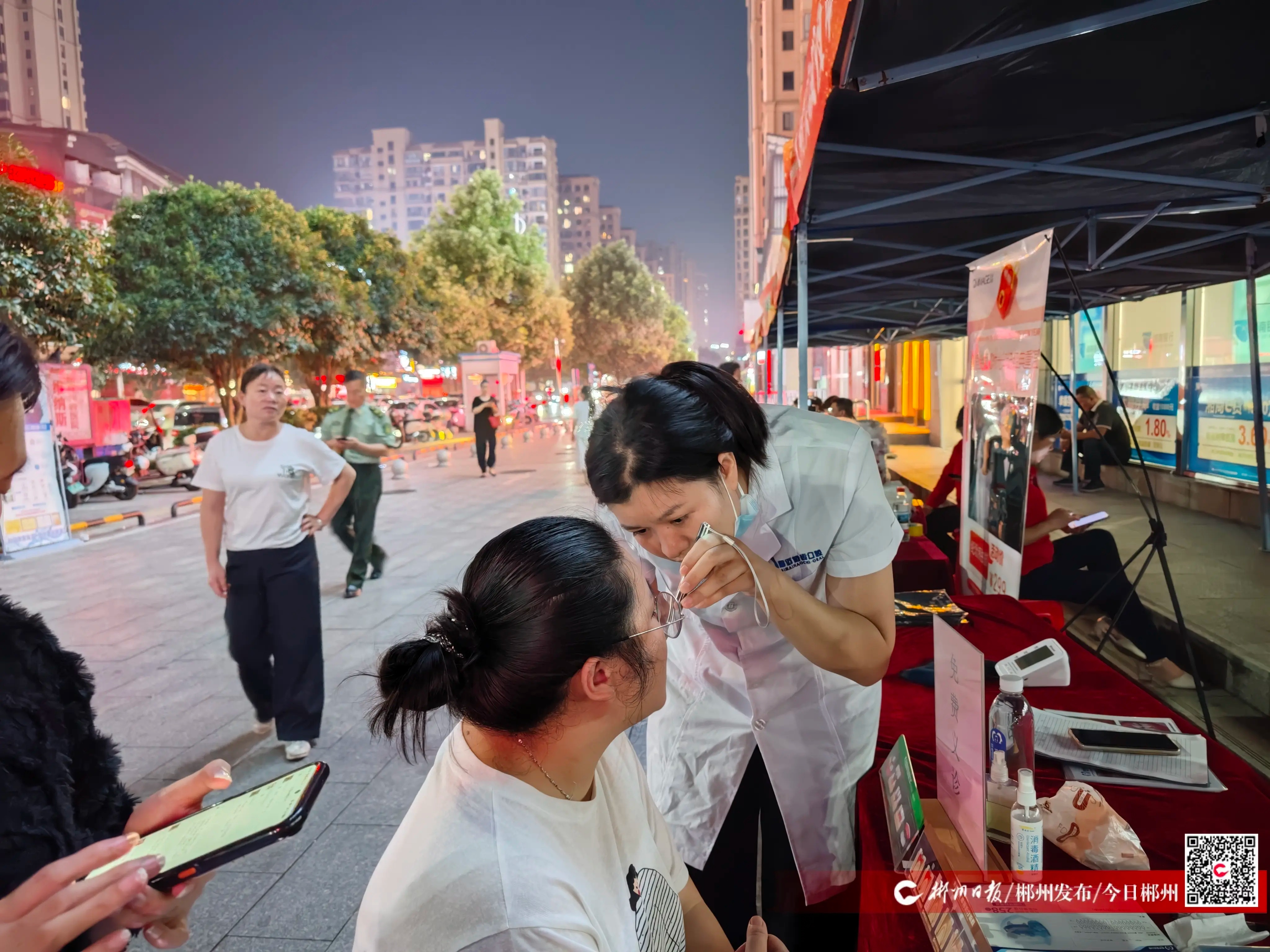活动分两大阶段。17时30分,“文明实践集市”活动率先点燃现场气氛:“文明交通·幸‘盔’有你”宣传展位上,摆满“文明交通”宣传资料;口腔医生细致地为居民检查牙齿,守护居民口腔健康;“郴品郴味”展台摆满本地特产,让居民近距离感受家乡味道;文明健康运动驿站里,篮球、羽毛球、足球等趣味运动设施摆放整齐,引得居民热情参与……