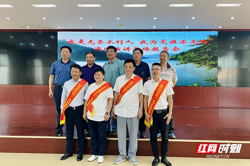 郴州市水利局领导给巡回演讲报告团的4位成员授佩“我是光荣水利人 我为党旗添光彩”绶带。图片来源:红网时刻