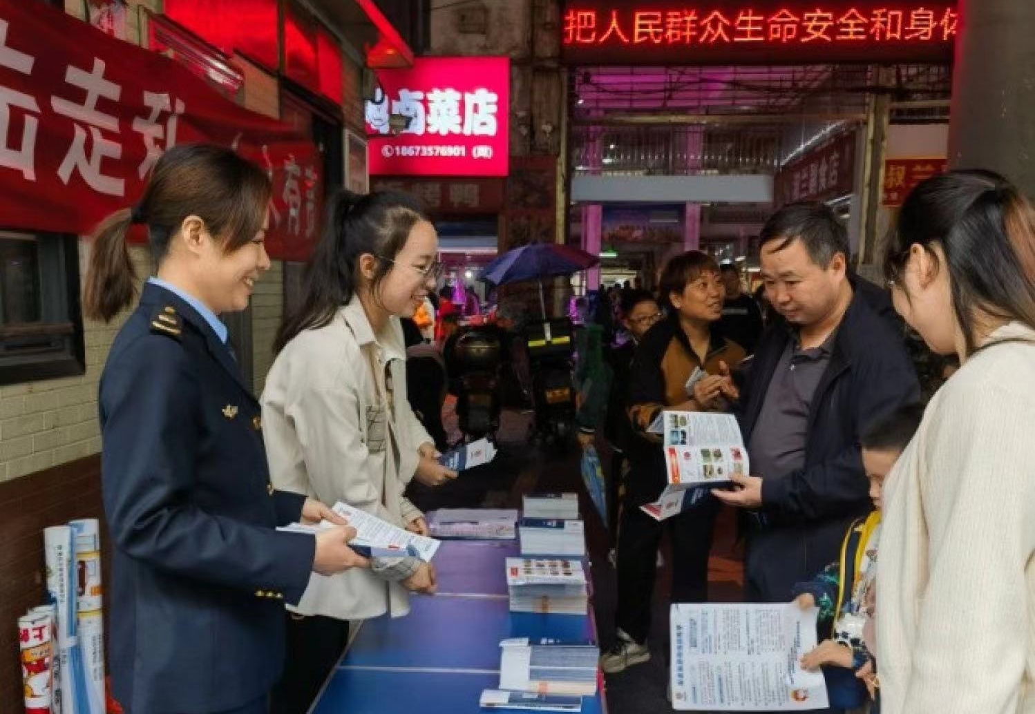 工作人员走进农贸市场,向居民和商户科普走私行为的危害和相关法律法规