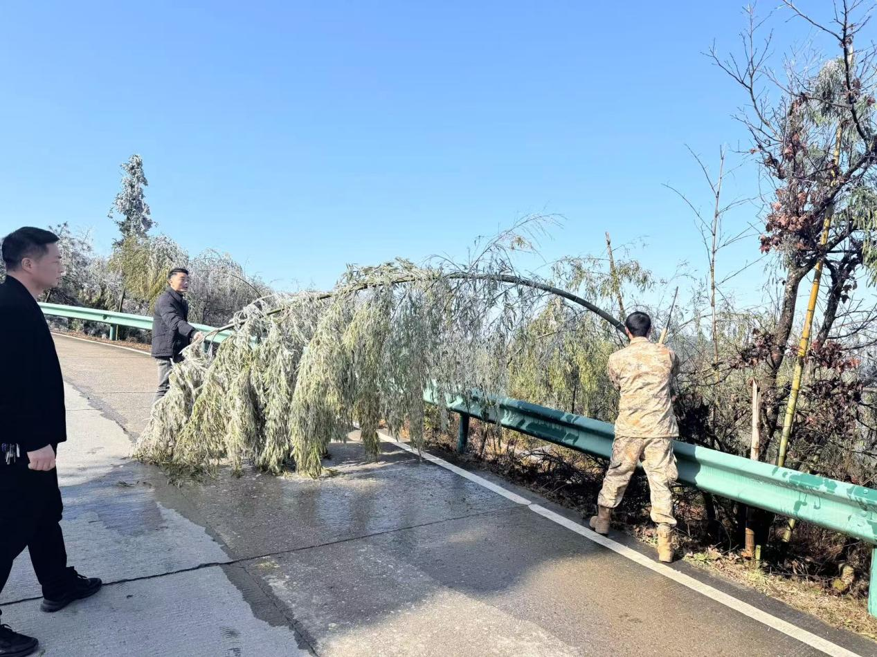 在了解到道路结冰情况后,该乡组织武装专干亲自带队,携带除雪工具和砍竹工具,第一时间赶赴辖区结冰路段。大家分工协作,用铁锹铲除冰层,用扫帚清扫路面,全力清除道路积雪和结冰,将路边倒伏的竹子砍除,为过往车辆和行人开辟安全通道。