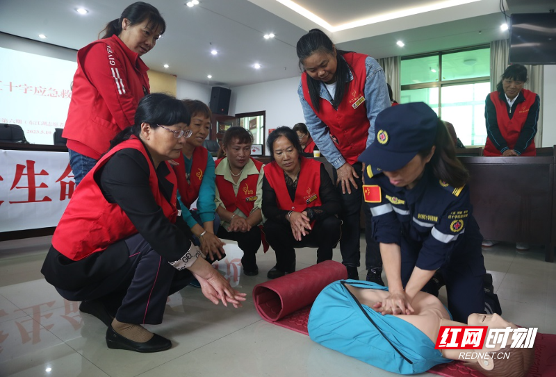 活动现场,资兴市红十字应急救援队队员通过模拟有人落水场景,向参加培训的学员们详细讲解了心肺复苏基本操作及溺水急救知识,并现场演示心肺复苏实施、胸外按压、创伤止血包扎等应急救援技能,增强群众的急救能力。