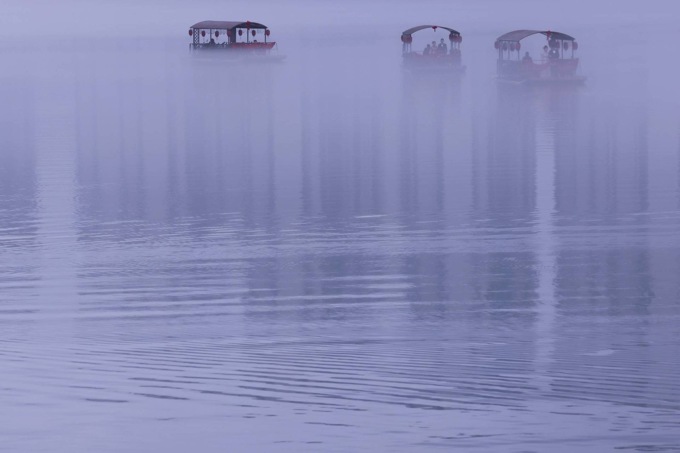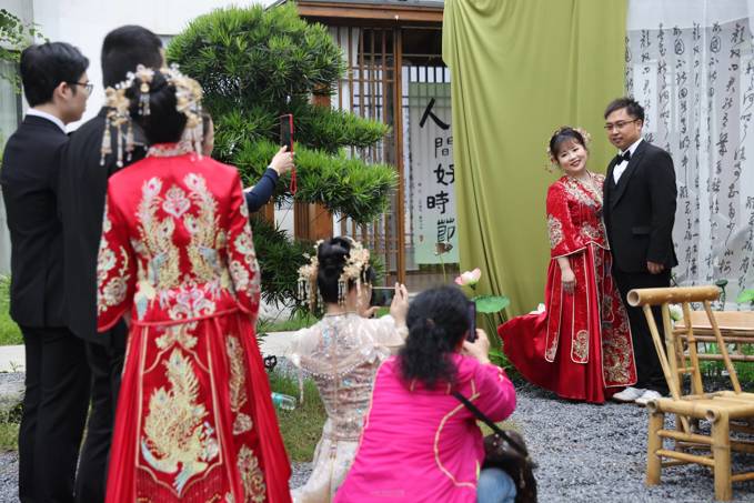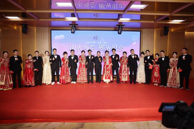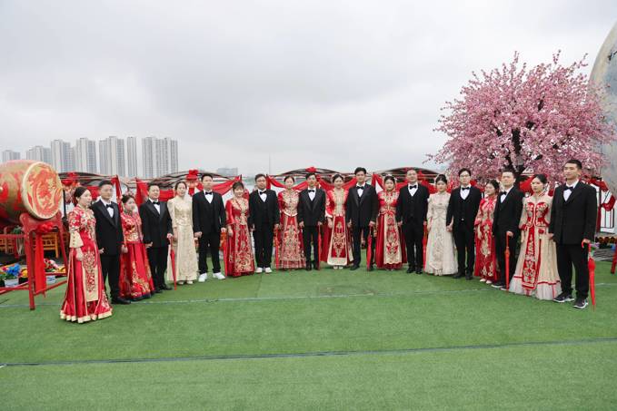 5月20日,小满。上午九时许,郴州东江湖面上划过十余艘画舫,伴着喜庆的婚礼乐曲,10对新人身穿新中式婚服,迎着清晨的薄雾,穿过宛如仙境的湖面,携手踏船而来。随后,他们一起参加了“湘亲湘爱” 集体婚礼。