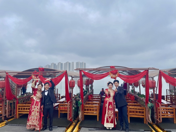 当天,活动现场,新人们从东江广场乘船而来,红衣配绿水,两岸风景如画。他们满脸微笑,满怀对未来的期待与憧憬,在水上舞台拍摄“水誓山盟”VCR后,携手穿过雅阁码头的幸福花丛,共同迈入雅阁酒店婚礼现场。
