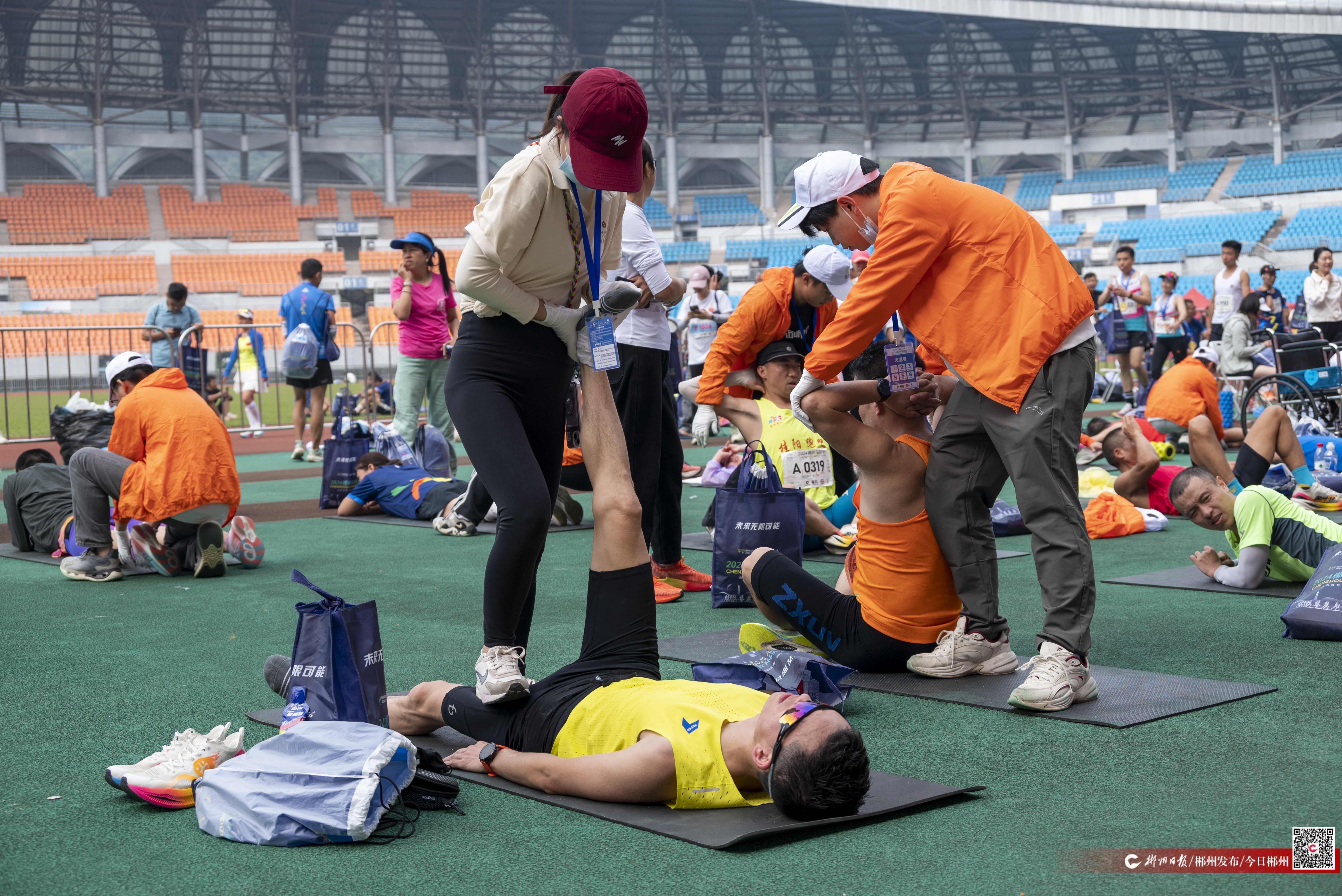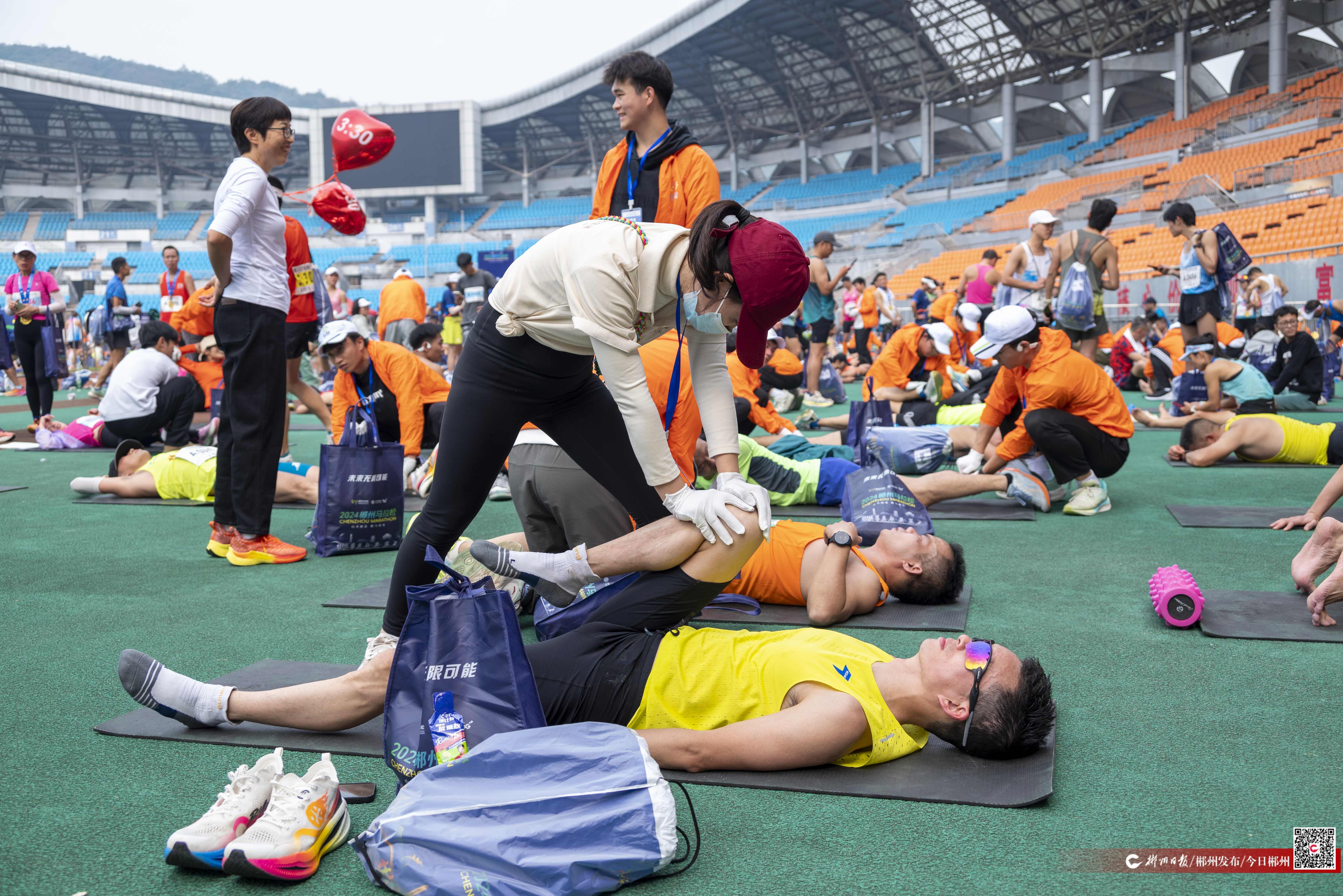 11月10日,在郴州体育中心,一群志愿者正为郴州马拉松参赛选手提供赛后拉伸服务。
