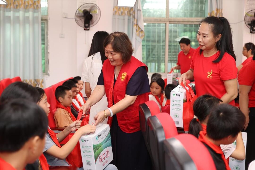 图为志愿者为州门司镇波水小学的孩子们赠送牛奶、学习文具等爱心物资